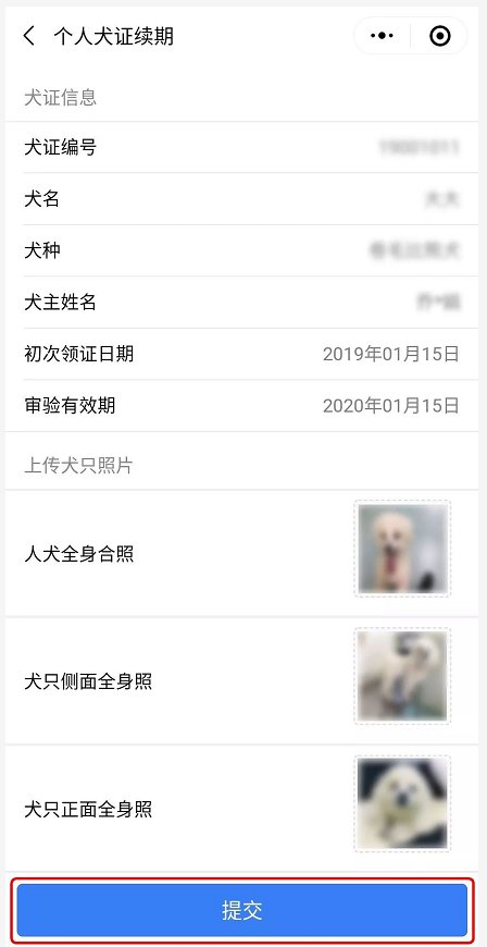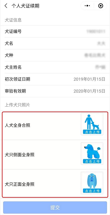 4、經(jīng)過一年,愛犬已經(jīng)長大啦,請在上方重新上傳近期您與愛犬的合照,以及近期愛犬的側(cè)面、正面全身照。好后,點擊下方“提交”按鈕。