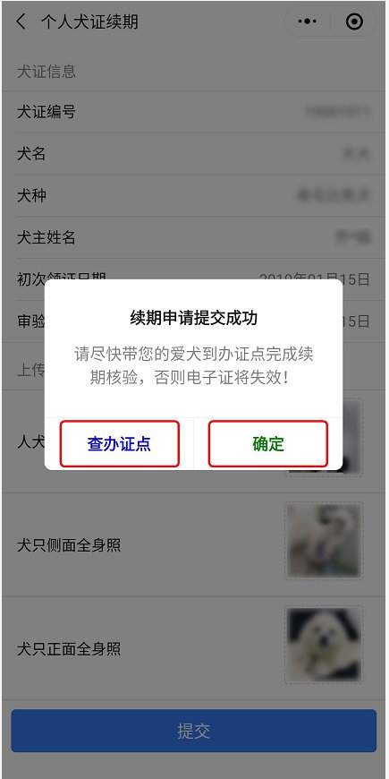 5、提交成功,您可以點擊“確定”,帶上愛犬到原辦理點辦理續(xù)期審核,也可以點擊“查辦證點”選擇就近的辦理點辦理續(xù)期審核。