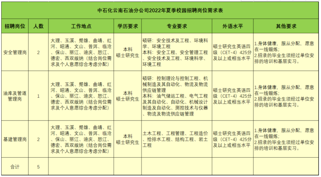 中國(guó)石化銷售股份有限公司云南石油分公司(以下簡(jiǎn)稱中石化化云南石油分公司)作為中國(guó)石化直屬企業(yè),2022年夏季校園招聘計(jì)劃為5人。本次夏季校園招聘工作現(xiàn)已啟動(dòng),請(qǐng)有意向的畢業(yè)生按以下要求報(bào)名。