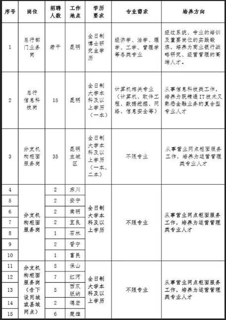富滇銀行倡導(dǎo)和堅(jiān)持“以人為本”的人才理念,積極為應(yīng)屆畢業(yè)生提供有競爭力的薪酬、完善的福利、專業(yè)的培訓(xùn)體系、廣闊職業(yè)晉升通道和發(fā)展平臺(tái)。根據(jù)業(yè)務(wù)發(fā)展需要,富滇銀行啟動(dòng)2019年校園招聘,現(xiàn)將有關(guān)事項(xiàng)公告如下: