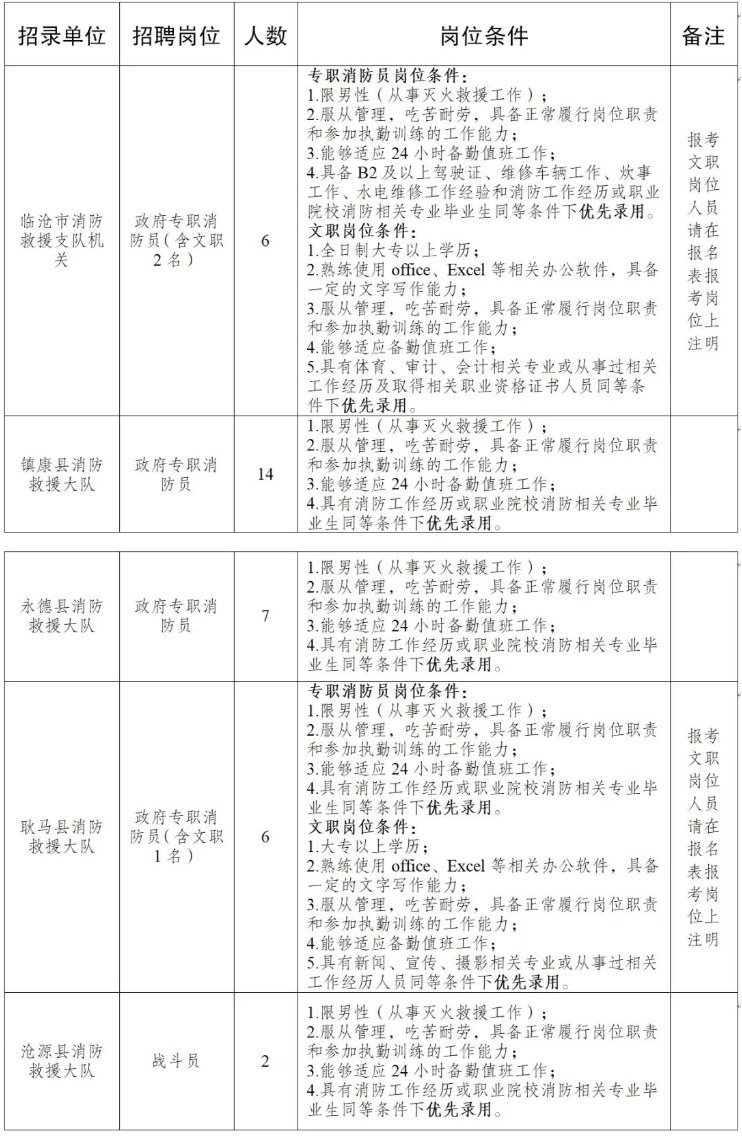 因工作需要,臨滄市消防救援支隊面向社會招聘政府專職消防員,現(xiàn)將招聘信息公告如下: