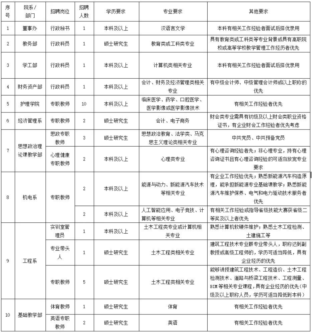 50周歲以下,本科及以上學(xué)歷,中級(jí)及以上職稱,計(jì)算機(jī)、人工智能、汽修、信息管理、旅游管理、烹飪與營(yíng)養(yǎng)、醫(yī)學(xué)類、教育管理等專業(yè)或相近專業(yè)教育背景,本崗位工作經(jīng)歷超過(guò)3年以上;有對(duì)應(yīng)相關(guān)專業(yè)的教學(xué)科研工作經(jīng)歷;對(duì)專業(yè)(群)建設(shè)具有戰(zhàn)略性構(gòu)想和創(chuàng)新性思維;有帶領(lǐng)教師團(tuán)隊(duì)建設(shè)一流專業(yè)的能力;持副高級(jí)以上職稱、碩士研究生與博士研究生優(yōu)先聘用。(博士、教授,男放寬至60周歲以下,女放寬至55周歲以下)。
