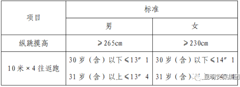 3.縱跳摸高、10米×4往返跑科目采取一票否決制,達(dá)到規(guī)定項(xiàng)目標(biāo)準(zhǔn)即為合格,否則為不合格,不合格人員不得參與后續(xù)環(huán)節(jié)的考核,測(cè)試標(biāo)準(zhǔn):