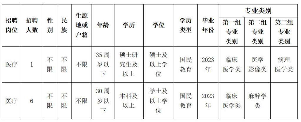 高等院校醫(yī)學(xué)類(lèi)本科及以上學(xué)歷畢業(yè)后直接參加國(guó)家計(jì)劃內(nèi)住院醫(yī)師規(guī)范化培訓(xùn),2023年國(guó)家住院醫(yī)師規(guī)范化培訓(xùn)合格且具有國(guó)家執(zhí)業(yè)醫(yī)師資格,參加醫(yī)療衛(wèi)生行業(yè)招聘醫(yī)學(xué)類(lèi)崗位的,視為2023年度應(yīng)屆畢業(yè)生(資格復(fù)審時(shí)須提供成績(jī)單、合格證明,否則取消聘用資格)。