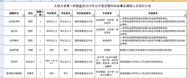 因工作需要,大理大學(xué)第一附屬醫(yī)院面向社會(huì)公開(kāi)急招第四批非事業(yè)編制工作人員29名,現(xiàn)將有關(guān)招聘事宜公告如下: