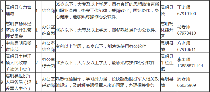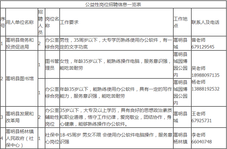 招聘具體事宜請咨詢用人單位。符合公益性崗位上崗條件的個人也可以到嵩明縣勞動就業(yè)服務局綜合科申請公益性崗位求職登記,詳詢陳老師:0871-67917444。