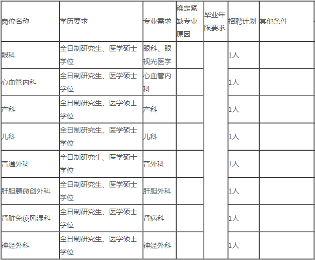 (一)市人民醫(yī)院。引進崗位8個,其中眼科1個、心血管內(nèi)科1個、產(chǎn)科1個、兒科1個、普通外科1個、肝膽胰微創(chuàng)外科1個、腎臟免疫風(fēng)濕科1個、神經(jīng)外科1個。