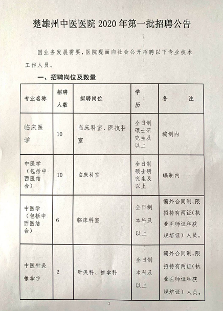 楚雄州中醫(yī)醫(yī)院2020年第一批招聘公告