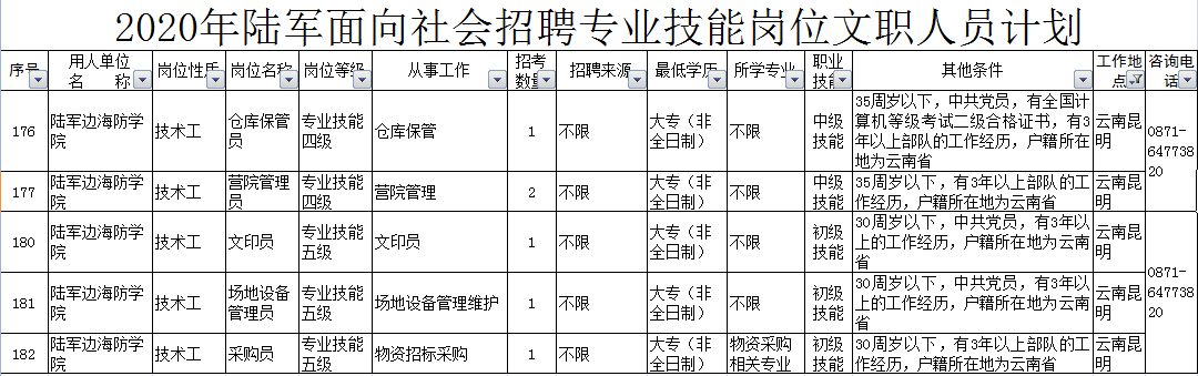 根據(jù)《中國人民解放軍文職人員條例》及有關政策規(guī)定,陸軍2020年將面向社會招聘912名專業(yè)技能崗位文職人員,F(xiàn)就有關事項公告如下: